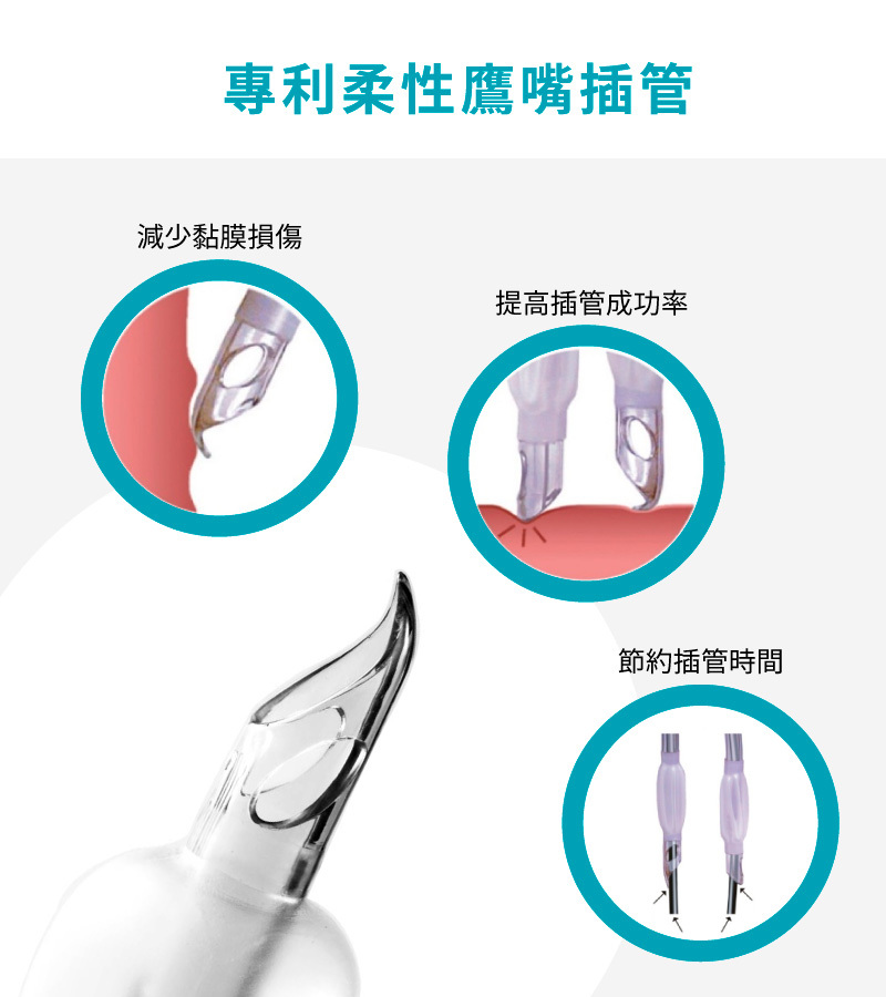 管子柔軟端在遇到阻物時(如構造變形、狹小)能順利滑行通過,提高插管的成功率
